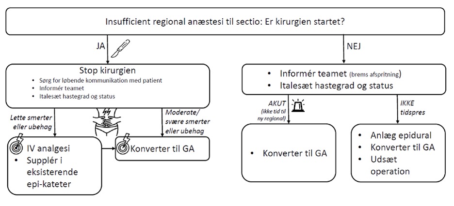 - Generel anæstesi kan være mest hensigtsmæssig i nogle situationer. Fx kan meget tidskritiske tilstande, cirkulatorisk instabilitet, insufficient regional, manglende samtykke til regional eller kontraindikationer mod regional være gode grunde til at vælge generel anæstesi (se flowchart, figur 2)
