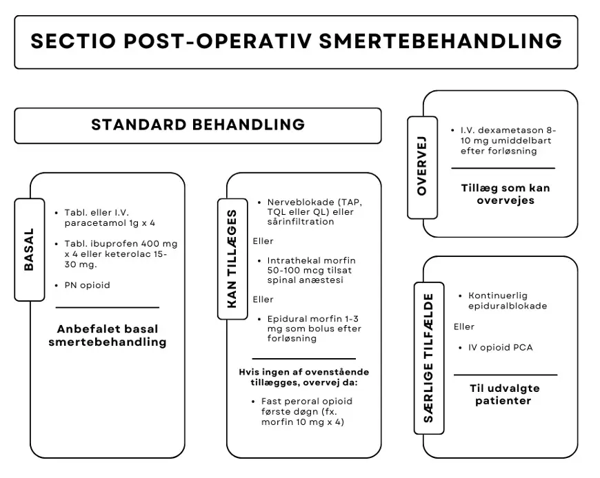 Format og indhold er i overensstemmelse med DASAIMs forskrifter, og godkendt af DASAIMs bestyrelse. Behandlingsvejledningen henvender sig primært til anæstesiologer, der varetager anæstesi til sectio, men vil også være relevant for øvrigt personale der behandler sectio patienter perioperativt.