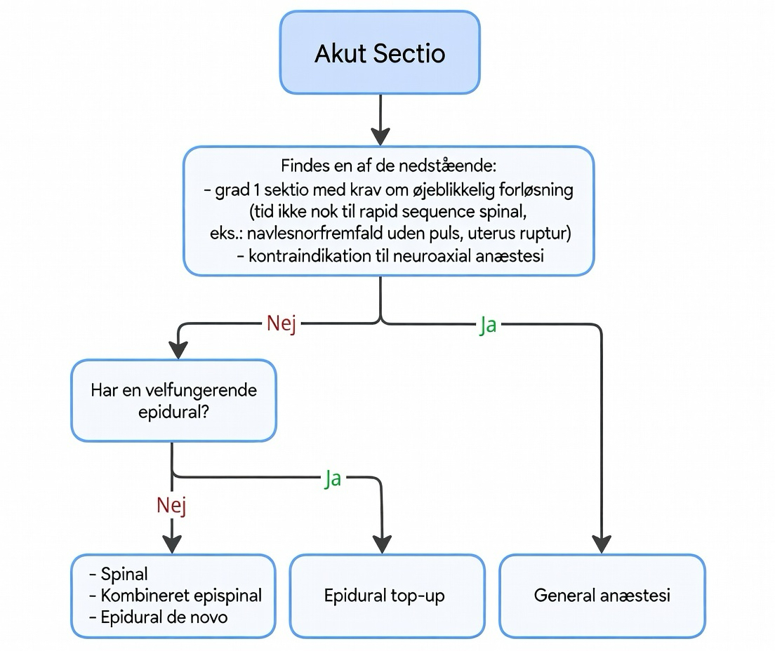 - Det anbefales, at et eksisterende velfungerende epiduralkateter, som udgangspunkt, anvendes som alternativ til spinal eller generel anæstesi ved akut sectio